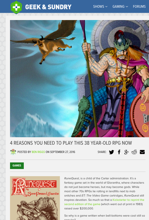 Geek & Sundry deftly explains why while most other 70s RPGs lie rotting in landfills, RuneQuest still inspires devotion. And Sandy Petersen himself has some interesting points to make about RQ's singular appeal...
