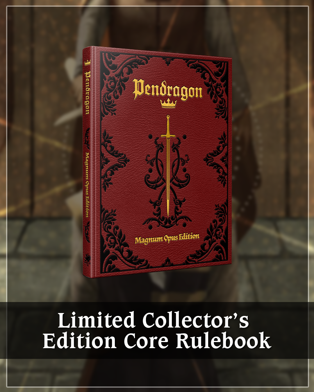 This special collector’s edition of the Pendragon Core Rulebook is bound in a rich red-and-gold leatherette, featuring a quote from designer Greg Stafford in gold text on the back cover.