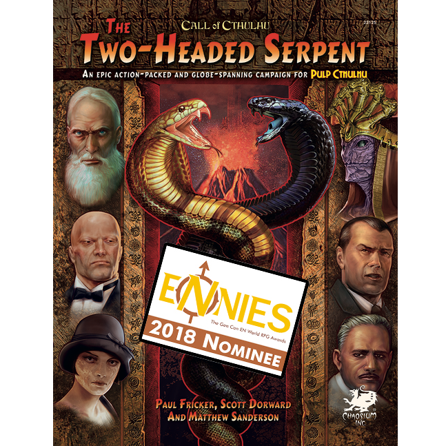 Congratulations to writers Scott Dorward, Paul Fricker and Matt Sanderson. Show your appreciation by voting in the ENnies for The Two-Headed Serpent and all the other Chaosium nominations!