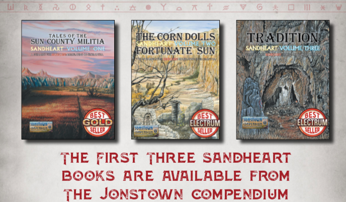 The four-part Sandheart series is available in the Jonstown Compendium at DriveThruRPG in PDF and print formats. And to celebrate the publication of Book 4, prices of the first three books have been discounted by $2.00 in all formats. PDFs are now $9.95, and hardcovers are just $19.95.