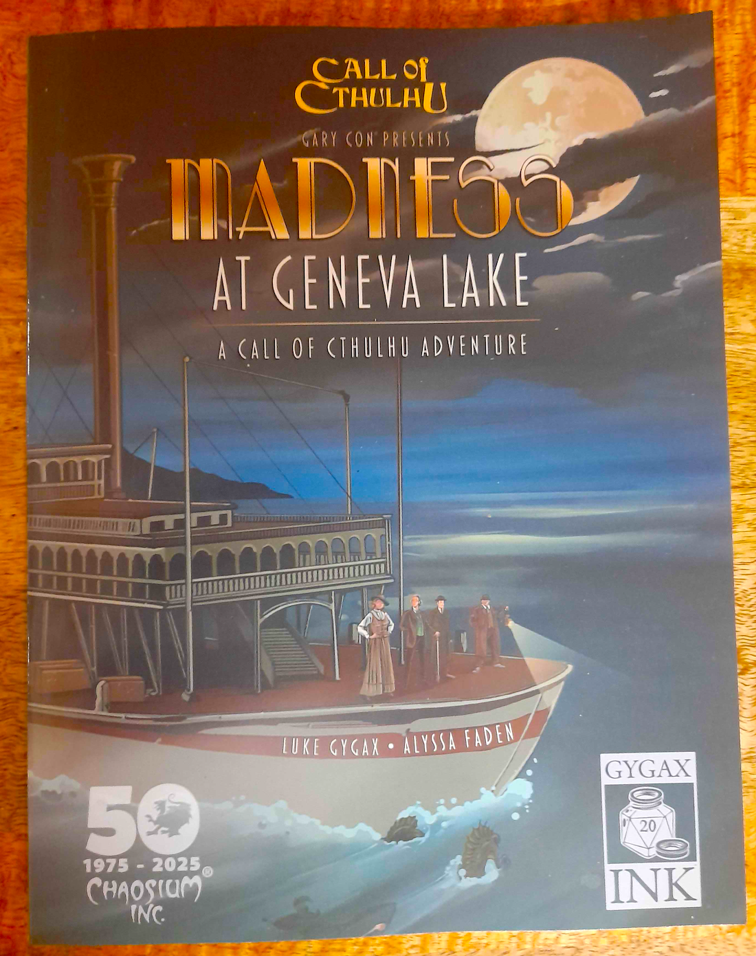 We'll have print copies of Madness at Geneva Lake available at the convention; you'll also be able to buy Luke Gygax and Alyssa Faden's new Call of Cthulhu scenario in print and PDF at DriveThruRPG on Friday May 23rd.