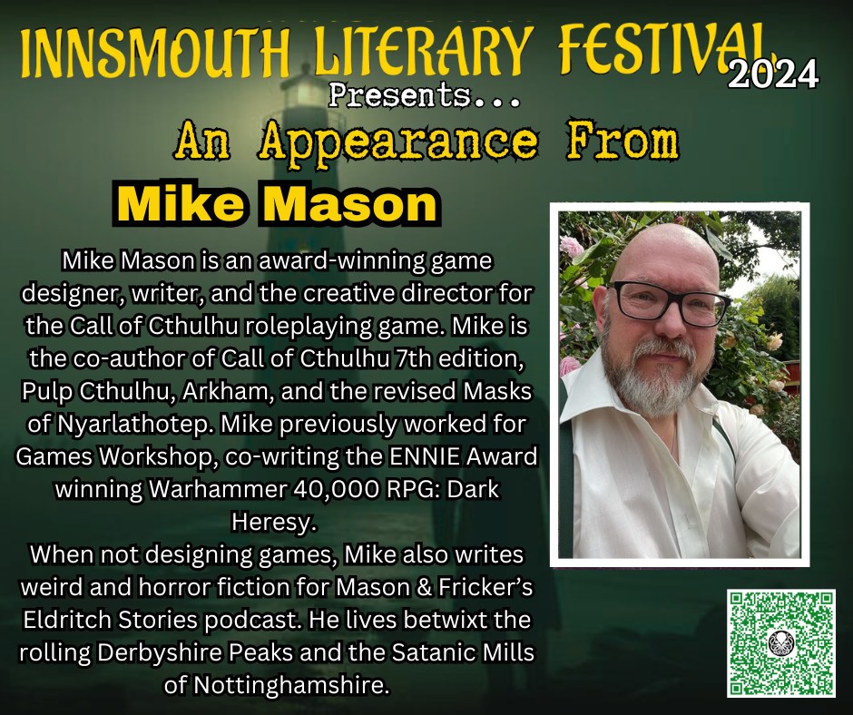 Call of Cthulhu creative director Mike Mason and associate editor Paul Fricker will both be appearing at the Innsmouth Literary Festival in Bedford UK on September 28th. Mike and Paul will be taking part in panels. Call of Cthulhu gaming is also part of the festival program.