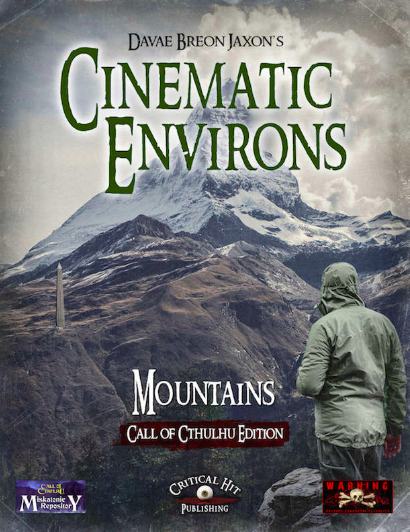 "Mountain Environs discusses the effects of altitude, falling, rock slides, cliffs and many other hazards that the characters will have to face if they are to reach the far side of the mountains in time." Also in the Cinematic Environs series: Arctic Lands, Desert Wastes. |