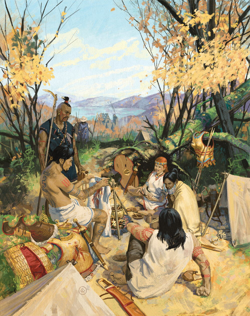 "Instead of the obvious choice of showing gear porn, I painted the group of pre-gen characters camping and enjoying each other's company after their previous encounters and before the eventual hard adventuring the next day, a scene that must be very common for any RPG group, but not often portrayed in the cover art. I am delighted Chaosium was happy to go with this kind of unorthodox cover image."