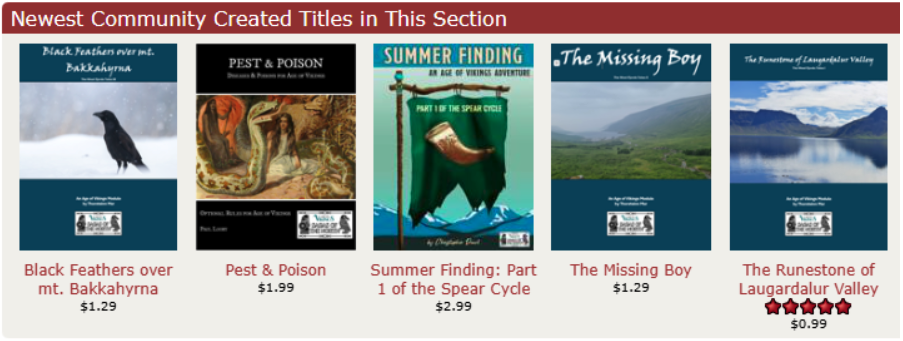 In these posts we'll highlight new releases in the Sagas of the North, our new community content program at DriveThruRPG. Here, independent creators can make and sell their own content for the award-winning Age of Vikings roleplaying game.
